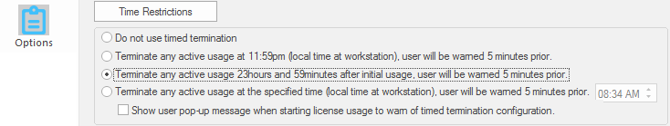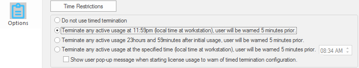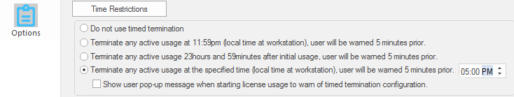 SofTrack's daily timed termination allows you to configure a specific hour and minute for a usage limitation of any application. Possible usage scenario includes ensuring shift workers have exited an application prior to the arrival of the next. And, when combined with Group Tracking and Time Restrictions you can control who can use any application and when. The user will receive an automatic 5-minute warning before the timed termination event.
