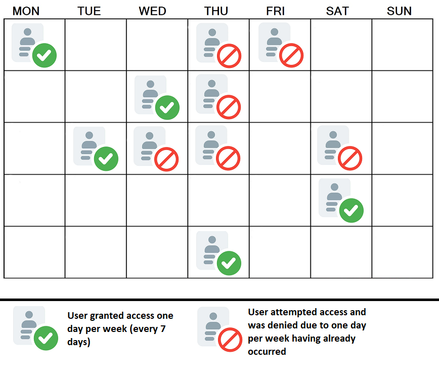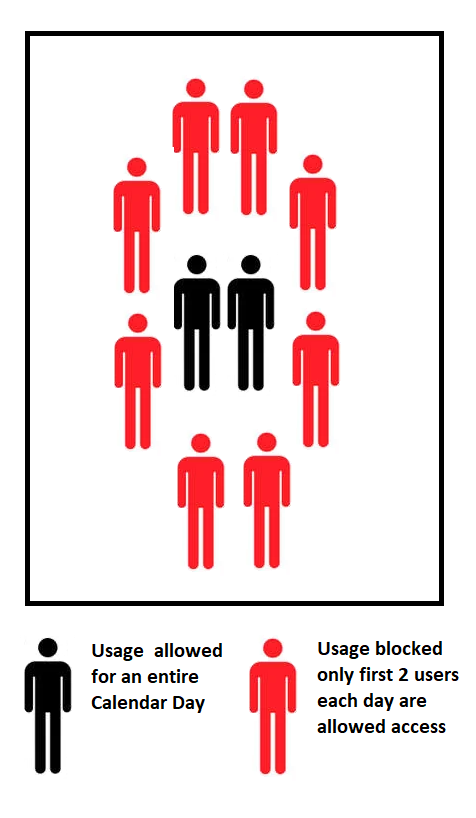 The following image provides a representation of each day's activity, in this example, the restriction is set to 2 users being allowed per day: